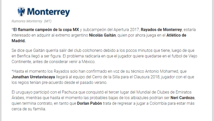 El mismo indica que si bien Gaitán está buscando tener minutos por la proximidad al Mundial de Rusia, no vería con buenos ojos una llegada a México ya que confía en poder tener revancha en un equipo europeo.