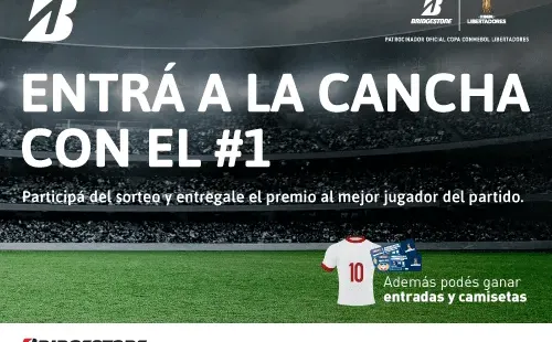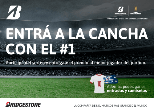 Promoción sin obligación de compra válida para la República Argentina excepto las provincias de Río Negro, Mendoza, Jujuy y Salta, desde el 30 de julio de 2018 hasta el 28 de noviembre de 2018 inclusive, o hasta que el último equipo argentino sea eliminado del certamen “Copa Conmebol Libertadores”. Para participar del sorteo de un pase para acceder al campo de juego finalizado el partido a acompañar a un directivo a entregar el premio al mejor jugador junto con un par de entradas para el ganador y un acompañante (dejándose constancia de que únicamente quien sea determinado ganador podrá acceder al campo de juego, no así su acompañante), 4 pares de entradas, 2 camisetas del equipo que el Participante que sea determinado como Potencial ganador haya elegido al momento de completar el formulario ingresá tus datos en el formulario de sorteo disponible https://www.bridgestone.com.ar/es/copalibertadores. Consultá términos y condiciones de la promoción en https://www.bridgestone.com.ar/es/copalibertadores