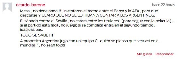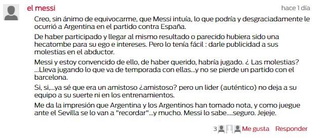 Luego de la dura derrota ante España,Messivolórápidamente desde Madrid junto a Piqué, Iniesta,Alba yBusquetspara retomar las actividades junto alBarcelona y se entrenó a la par de sus compañeros, lo cual generó un gran malestar y llenó de dudas atoda la Argentina.