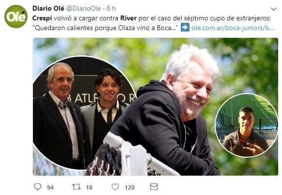 Pero Juan Carlos Crspi, que sigue muy ligado a Boca pese a no ocupar actualmente ningún cargo en la comisión directiva, no tardó en salir al cruce del Muñeco:“¿Por qué protestan tanto? Se quedaron calientes porque Olaza, al final, vino a Boca y no fue a River.Esto es simple: para comprar tenés que tener plata, gratis no hay nada. Y Boca no sólo tiene un plantel joven y vendible sino que también tiene una buena administración económica. Ellos no tienen nada de eso.Fijate las edades de sus jugadores. Lo único que tienen para vender es al Pityy no es comunitario. Por eso están nerviosos”, disparó en diálogo conOlé.