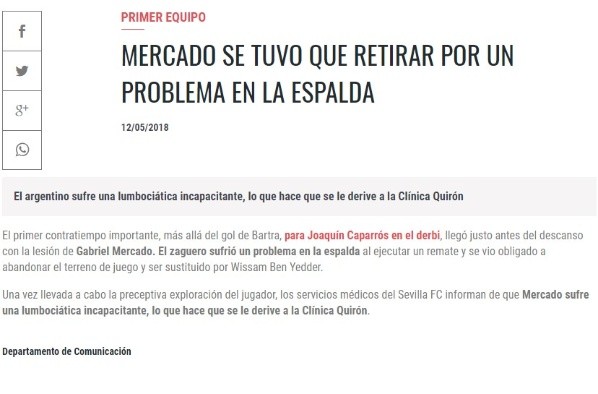 La lesión que obligó a Gabriel Mercado a abandonar el campo de juego a los 43 minutos del partido entre Betis y Sevilla fue diagnosticada como una lumbociáticaincapacitante, un término no del todo común en el ambiente futbolero.