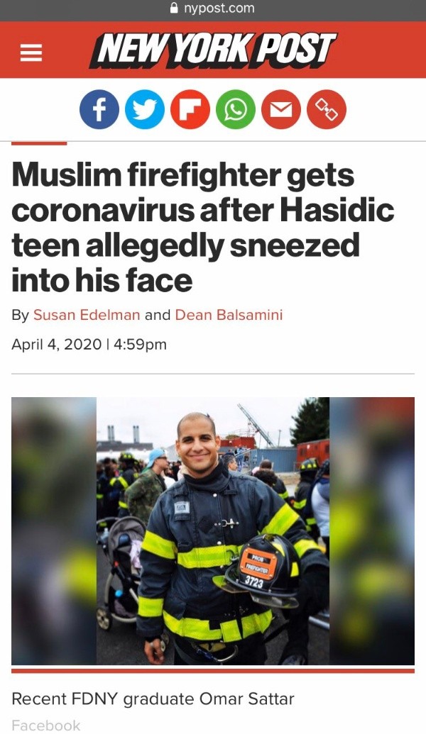 Además de un acto de vandalismo, podría tratarse también de un delito racial. Es que según informaron en el New York Post, los tres adolescentes eran judíos ortodoxos, mientras que el bombero, recién recibido, era musulmán. Nueve días después de tan lamentable suceso, supo que sus análisis de coronavirus habían dado positivos.Los hechos ocurrieron en Borough Park, Brooklyn, y fueron descritos en una carta del Departamento de Bomberos.