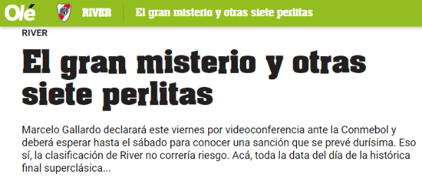 Luego de imponerse por 2 a 1 ante Gremio y clasificar a la final de la Copa Libertadores, MarceloGallardo, dialogando con los medios, se mostró muy enojado por la decisión de Conmebol de sancionarlo.