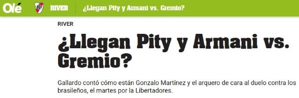 Sin embargo, llamó la atención ver que MarceloGallardo no les dio siquiera unos minutos en el campo de juego a Franco Armani y Gonzalo Martínez, dos figuras que serán fundamentales en el cotejo ante Gremio.