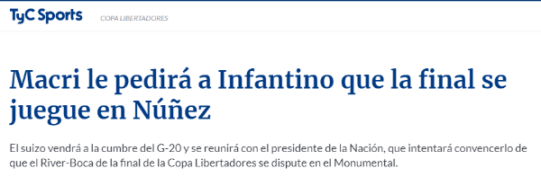Aparentemente, aprovechando el retorno de Infantino a Argentina, Macri dialogará con él para que haga fuerza para que la revancha se juegue en Argentina y no sea sacada el país (fruto de los incidentes, Conmebol evalúa esto).