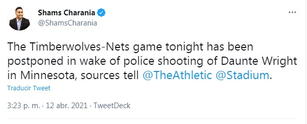 Por ello, el encuentro entre Minnesota Timberwolves y Brooklyn Nets fue suspendido, así lo dio a conocer Shams Chanaria, reconocido insider de la NBA. Por otro lado, el choque entre Minnesota Twins y Boston Red Sox también se canceló por el mismo motivo.
