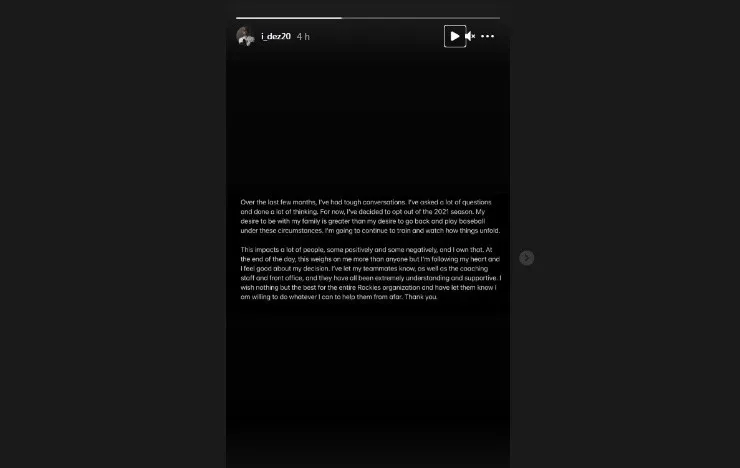 Se trata de Ian Desmond, de Colorado Rockies, quien confesó en su cuenta oficial de Instagram no sentirse seguro para jugar, por lo cual prefiere estar en este periodo de tiempo con su familia, aunque enfatizó que la decisión se es un “por ahora”, mientras ve cómo se desenvuelve este asunto de la pandemia.