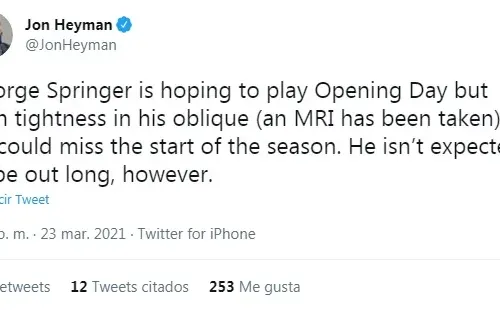 Sin embargo, puede que para el primer día de la venidera zafra en Las Mayores, el ex toletero de Houston Astros no esté disponible a consecuencia de molestias en su oblicuo, según arrojó una resonancia magnética realizada al pelotero.
