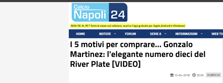 La páginaCalcio Napolipublicó en el especial “Los 5 motivos para fichar aPityMartínez”, entre los que destaca su elegancia, velocidad y definición.