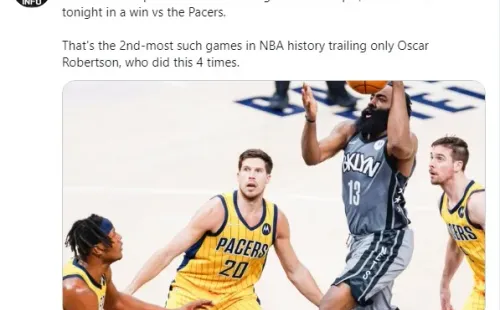 Este triple doble de James Harden ante los Pacers representó el tercero que conseguido con 40 unidades o más, escalando hasta el segundo puesto de este registro, siendo superado solamente por Oscar Robertson, quien hizo de las suyas con cuatro.
