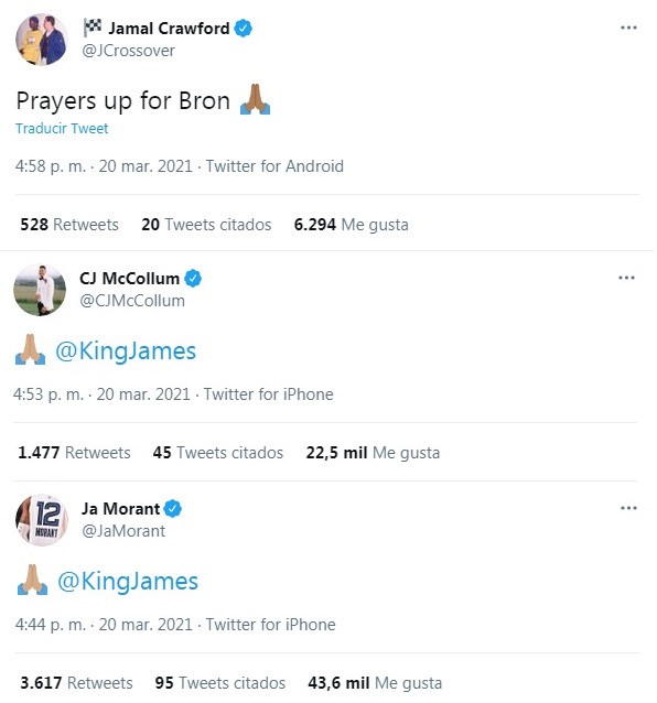 Jamal Crawford, Ja Morant, CJMcCollum y Trae Young enviaron sus respectivos mensajes de recuperación y afecto hacia “The King”. De hecho, la joven estrella de los Hawks comentó a Sarah Spencer que “Espera que todo esté bien con él”.