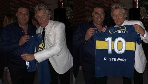 El máximo mandatario del líder absoluto que tiene la presente edición de la Superliga Argentina le regaló a Rod Stewart una camiseta de Boca con el nombre del músico y el número 10 en la espalda.