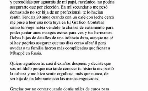 “En El Gráfico contastecómo tu viejo había vendido la alianza de casamiento para poder juntar unos mangos extras para vos y tus hermanos. Cómo tu mamá les decíaque tenía sueño y escondía que no tenía ese plato de más para ella. Dabas lujos de detalles de una infancia dura, trabajastecomo albañil para ayudar a tu familia, pero no sé si habrá sidomás complicadoque frenar a Mbappé en Rusia”, decía la carta. La emoción de los hinchas tanto de River como de otros equipos fue tal que comenzó a viralizarse en Twittery con la consigna “en una de esas la leés, Enzo”, llegó a manos de Pérez.
