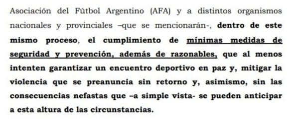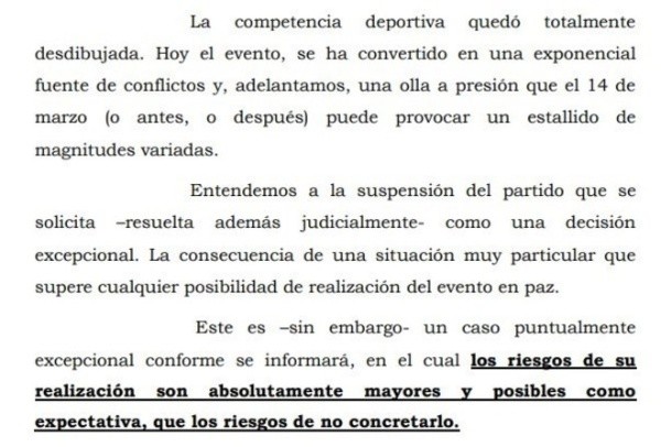 En dicho documento se piden diversas garantías para el desarrollo del cotejo: el cumplimiento de mínimas medidas de seguridad y prevención, que al menos intenten garantizar un encuentro deportivo en paz, y mitigar la violencia que se preanuncia sin retorno.