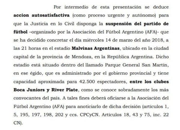El próximo 14 de marzo, en la provincia de Mendoza, River y Boca chocarán en el marco de la Supercopa Argentina. O al menos por ahora. Es que una asociación civil solicitó que el partido en cuestión se suspenda.