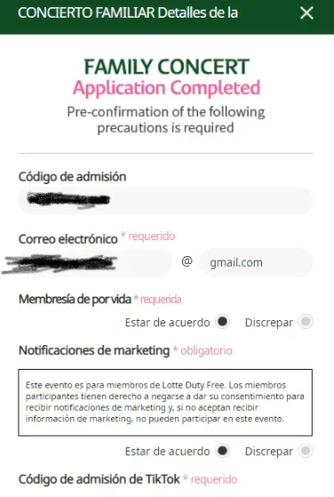 Asimismo, si aún no recibes el código por medio del correo. Debes ingresar a la web oficial, hacer click en el banner del concierto y luego bajas la pantalla hasta la sección “How to apply for Family Concert” y haces click en Check my application.Automaticamente aparecerá una ventana con tu código para acceder al concierto. Se recomienda ingresar antes para evitar que caiga la plataforma y no puedas acceder al concierto. Recuerda que si cierras la ventana, ya no podrás ingresar al concierto.