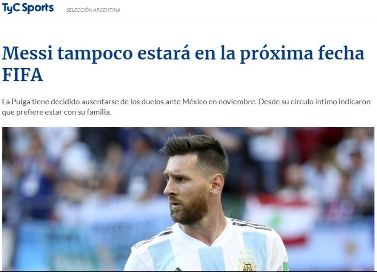En consecuencia, Messi se perderá la doble jornada de amistosos ante la Selección de México. Ambos encuentros se harán en tierras de La Albiceleste (Buenos Aires y San Juan).