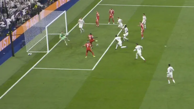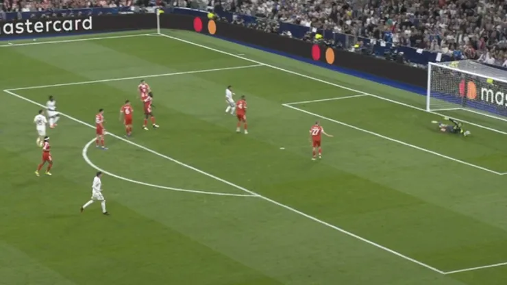 De un lateral defensivo del Madrid, el conjunto bávaro recuperó, combinó pases y Laimer pateó de afuera. Se fue por arriba del travesaño
