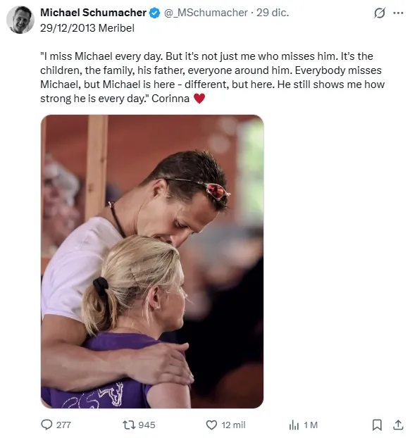 “Todos extrañan a Michael, pero Michael está aquí; diferente, pero aquí. Sigue demostrándome lo fuerte que es cada día“, expresó Corinna, conmoviendo a todos los fanáticos del automovilismo, que se deshicieron en mensajes de apoyo en los comentarios.