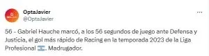 El gol de Gabriel Hauche para el 1-0 contra Defensa y Justicia, a los 56 segundos de haber iniciado el encuentro, es el tanto más precoz de Racing desde que comenzó la temporada 2023 de la Liga Profesional (Opta).