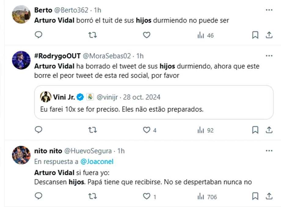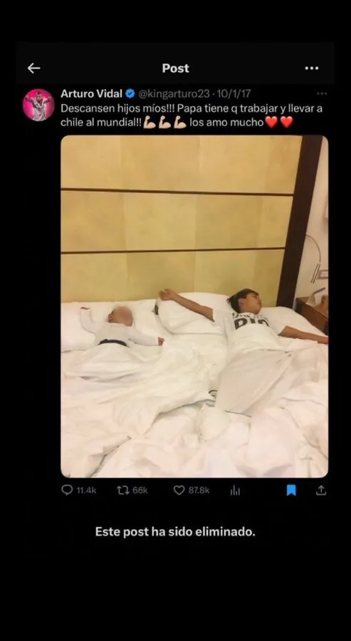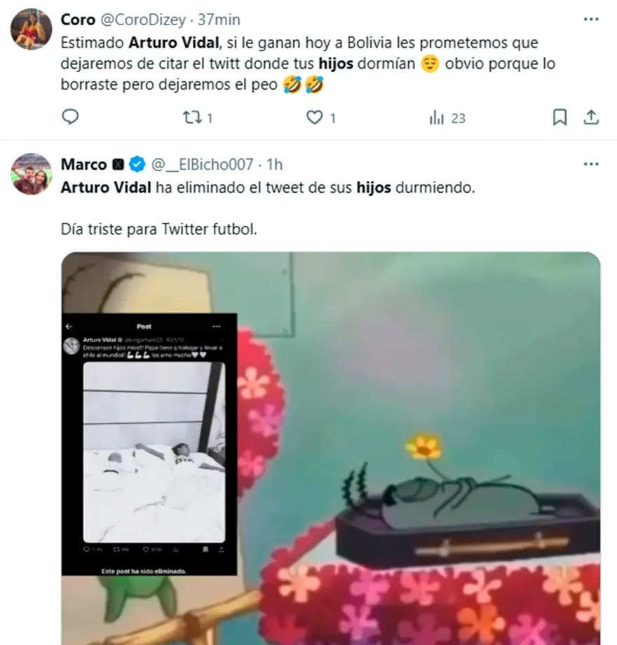 En ese contexto, la decisión de uno de los máximos referentes históricos de la Selección de Chile de borrar el tweet de sus hijos durmiendo, que le valió infinidad de memes y burlas durante casi una década, no pasó desapercibida en las redes sociales, provocando todo tipo de reacciones.