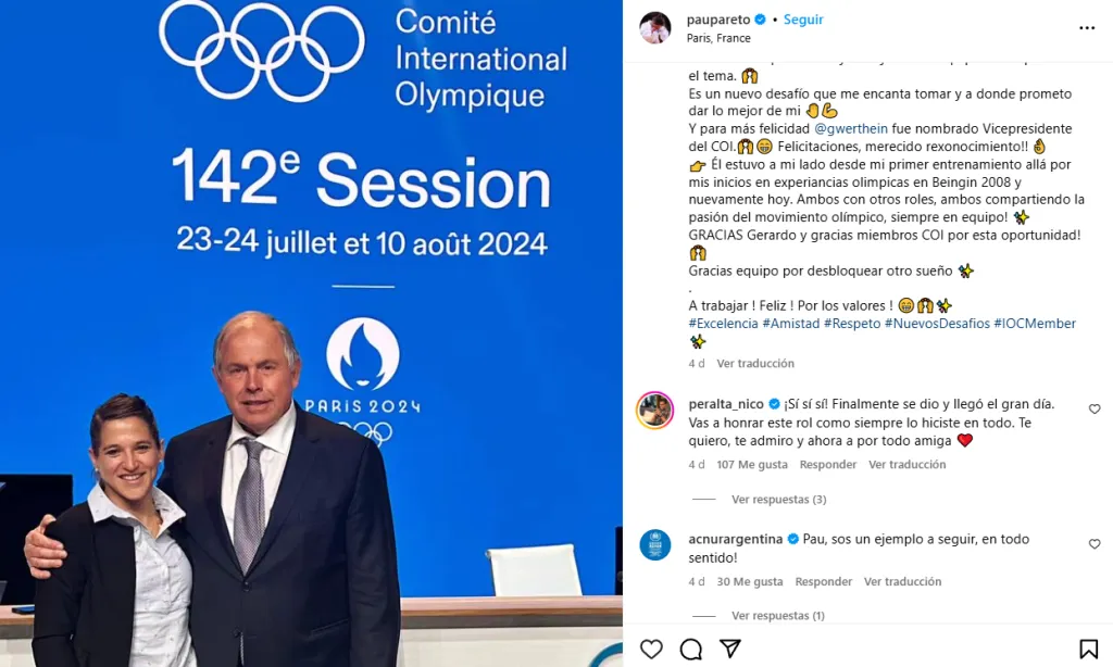 “Siempre me sentí parte, pero hoy puedo accionar y sumar con más fuerza, estando en contacto directo con las necesidades que existan y trabajando en equipo con expertos en el tema. Es un nuevo desafío que me encanta tomar y a donde prometo dar lo mejor de mi”. Luego, también hubo dedicatoria para Werthein: “Felicitaciones, ¡merecido reconocimiento! Él estuvo a mi lado desde mi primer entrenamiento allá por mis inicios en experiencias olímpicas en Beijing 2008 y nuevamente hoy. Ambos con otros roles, ambos compartiendo la pasión del movimiento olímpico, siempre en equipo. ¡Gracias Gerardo y gracias miembros COI por esta oportunidad! Gracias equipo por desbloquear otro sueño. A trabajar. Feliz. Por los valores”.