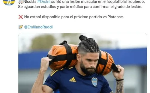 Según precisa Emiliano Raddi, periodista de ESPN,Orsini padece de una lesión muscular que lo descarta para jugar contra Platenseel próximo domingo en La Bombonera. Este lunes por la tarde será turno de hacerse estudios para conocer el grado de la lesión y se aguarda un parte médico oficial de Boca vía redes sociales.