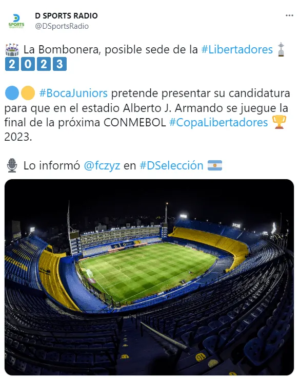 Tal como aseguróFernando Czyz, quien cubre a Boca para DirecTV Sports Radio y Doble Amarilla,Bocapretende presentar su candidatura para que en el estadio Alberto J. Armando se juegue la final de la próxima edición de la Copa Libertadores. ¿Qué dirán desde la organización?