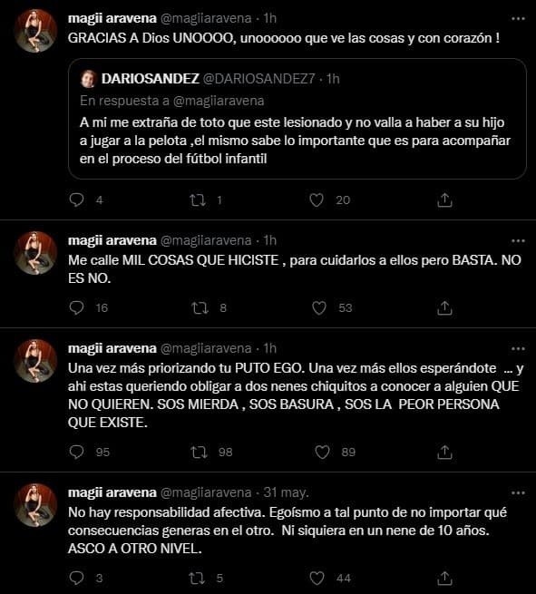 Magalí Aravena, la expareja del “Toto”, publicó una serie de tuits contra el futbolista.”Una vez más priorizando tu puto ego. Una vez más ellos esperándote… Y ahí estas queriendo obligar a dos nenes chiquitos a conocer a alguien que no quiere. Sos mierda, sos basura, sos la peor persona que existe”, señaló. Y agregó: “Me callé mil cosas que hiciste para cuidarlos a ellos pero basta. No es no”. Esto, y mucho más. Fue durísima.