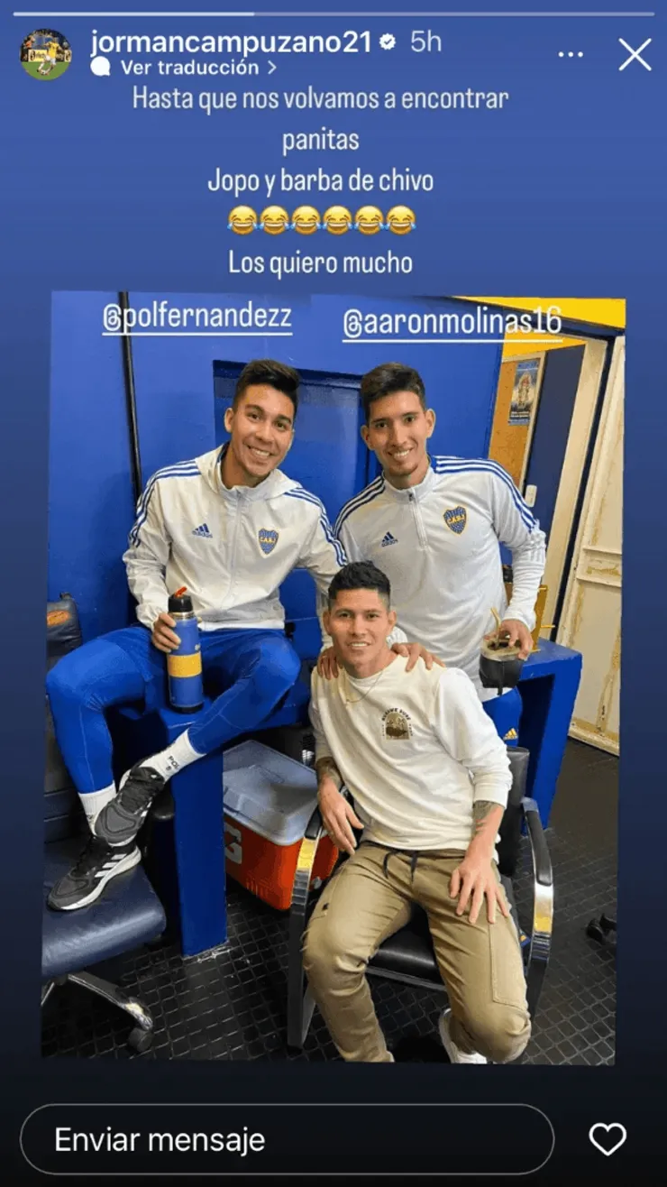 Compartiendo una historia en su Instagram junto conAaron Molinas y Pol Fernández, Campuzano se despidió de ambos volantes con peculiares apodos para cada uno de ellos en el sentido mensaje de adiós. “Hasta que nos volvamos a encontrar panitas,Jopo y barba de chivo. Los quiero mucho”, escribió el colombiano, haciendo una clara referencia a sus estilo de cortes de pelo y vello facial de Pol y Aaron respectivamente. ¡Llamativo!