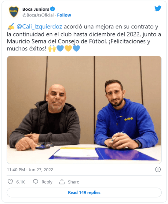 Si bien ya se había dado a conocer esa situación contractual del zaguero, la sorpresa es quela firma no incluyó una extensión del vínculo, ya que el mismo seguirá vigente hasta diciembre de este año.De esta manera, salvo que se sienten a negociar nuevamente, Izquierdoz empezará a transitar sus últimos seis meses en el club de la Ribera. ¿Seguirá en 2023?