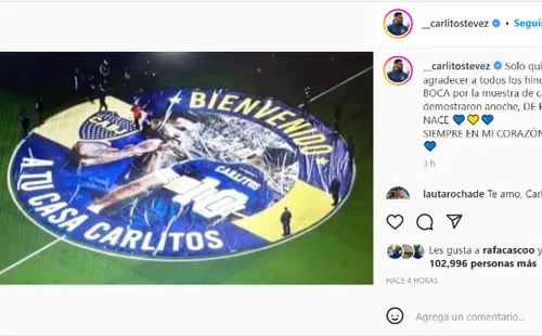 Con la foto de la bandera que desde el Xeneize le pusieron en el medio de la cancha, Carlitos escribió:“Solo quiero agradecer a todos los hinchas de Boca por la muestra de cariño que me demostraron anoche, de Boca se nace. Siempre en mi corazón, gracias”.
