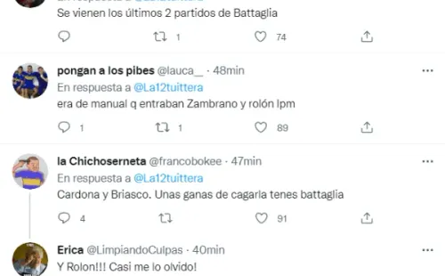 Una vez conocida la formación que paró Battaglia durante este jueves, los hinchas no se lo tomaron de la mejor manera. Inclusiones como las de Esteban Rolón, Frank Fabra y Norberto Briasco, entre otras, generaron la disconformidad en los fieles del Xeneize a 2 días del cruce contra Gimnasia.