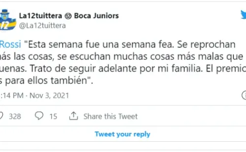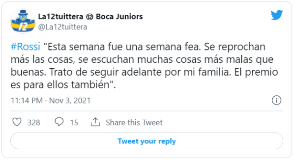 Por último, Rossi agradeció a su familia y cargó contra los que lo criticaban por su rendimiento: “Dejame mandar un saludo a mi señora, a mi mamá, a mi tía, a mis suegros… Lamentablemente pasó una semana fea. A veces cuesta seguir, pero bueno. Uno tiene que escuchar muchas cosas que se reprochan. A veces se reprochan más las cosas malas que las buenas y desde lo personal creo que son más las buenas que las malas. Estoy tranquilo, sigo con mucha fuerza, vengo de un año muy difícil, me tocó perder a mi papá el pasado y esto sigue. Trato de seguir adelante por mi familia, el premio es para ellos”.