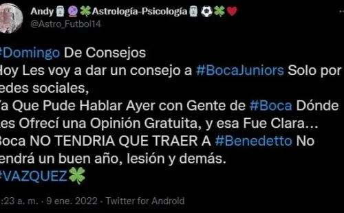 El el tarotista cuyo nombre en Twitter es @Astro_Futbol14 señaló: “Hoy les voy a dar un consejo a Boca Juniors solo por redes sociales, ya que pude hablar ayer con gente de Boca, donde les ofrecí una opinión gratuita. Y esa fue clara: Boca no tendría que traer a Benedetto. No tendrá un buen año. Lesión y demás”.