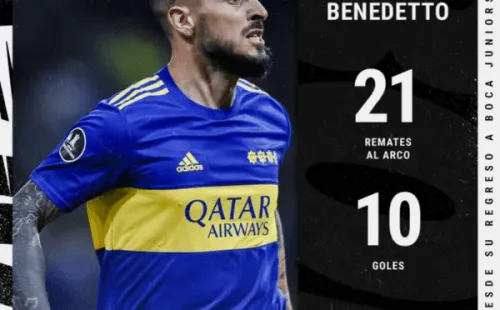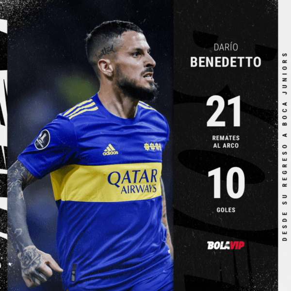 En esa cantidad de encuentros jugados, Benedetto convirtió 10tantos y lideró ampliamente la tabla de goleadores de Boca en 2022. ¿Cuántos remates necesitó? 36, de los cuáles 21fueron al arco. Es decir, 1de cada 2disparos a portería terminaron en un festejo. Impresionante.