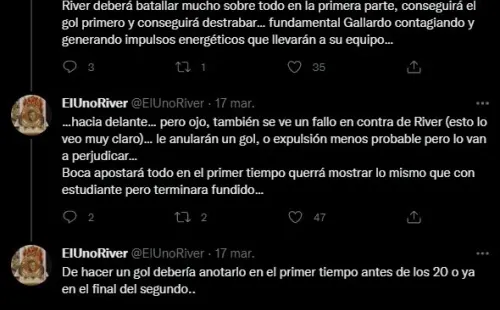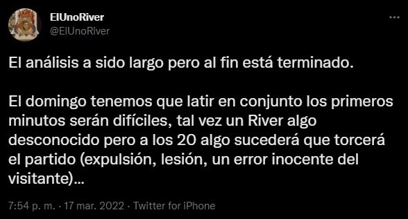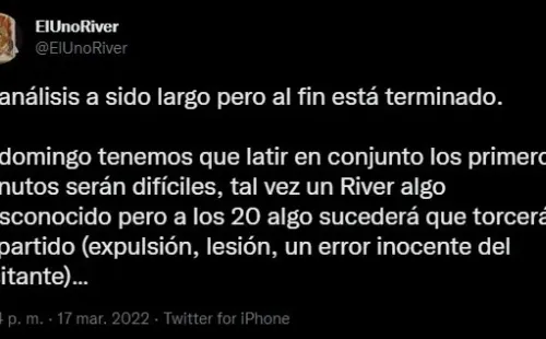“El Uno”, como se hace llamar en redes sociales, publicó un largo análisis de lo que vio en los astros. “El domingo tenemos que latir en conjunto. Los primeros minutos serán difíciles, tal vez un River algo desconocido pero a los 20 algo sucederá que torcerá el partido (expulsión, lesión, un error inocente del visitante)”, aseguró.