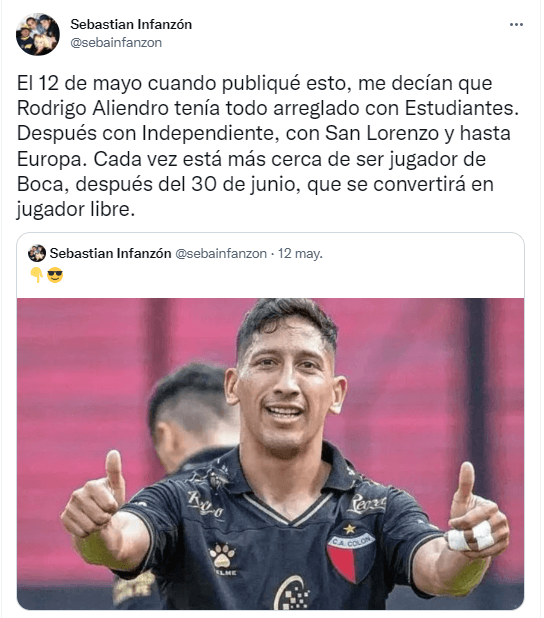 “El 12 de mayo cuando publiqué esto, me decían que Rodrigo Aliendro tenía todo arreglado con Estudiantes. Después con Independiente, con San Lorenzo y hasta Europa. Cada vez está más cerca de ser jugador de Boca, después del 30 de junio, que se convertirá en jugador libre”, escribió Sebastián Infanzón, periodista cercano al Consejo de Fútbol. ¿Será?