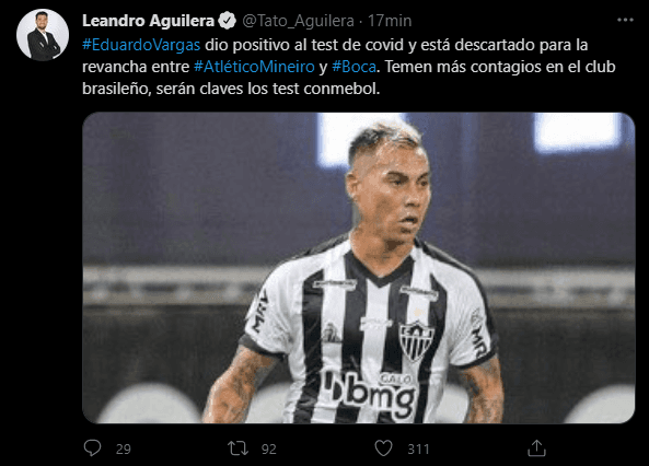 Impactante noticia llega desde Brasil. A tres días del duelo de vuelta entre Boca y Atlético Mineiro de los octavos de final de la Copa Libertadores, el delantero chileno Eduardo Vargas fue confirmado como positivo de Covid-19 y fue automáticamente aislado y descartado para el partido contra Boca.