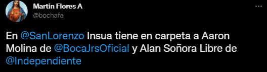 Además, el jornalista afirmó que el ex Independiente Alan Soñora también interesa en el Ciclón. Del lado de Boca, no confirmaron contactos de San Lorenzo por Molinas, pero el interés podría convertirse en oferta en las próximas semanas. ¿Se irá Aaron al conjunto de Insúa?