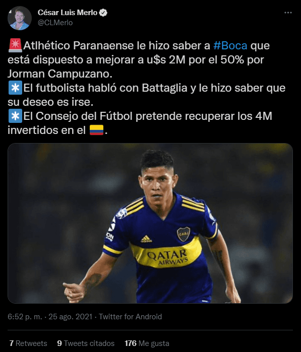 Ahora, según informó César Luis Merlo, el equipo de Curitiba prometió mejorar la oferta para hacerse con el jugador. El propio Campuzano habría hablado con Battaglia, quien le habríamanifestado su deseo de marcharse a un nuevo rumbo.