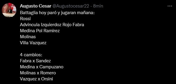 En total, el entrenador hará cuatro cambios con respecto a la formación de la semana pasada. Frank Fabra, Cristian Medina, Aaron Molinas y Luis Vázquez reemplazarán a Agustín Sández, Jorman Campuzano, Óscar Romero y Nicolás Orsini. La mayoría son decisiones tácticas pero el paraguayo está tocado y prefirió darle descanso.