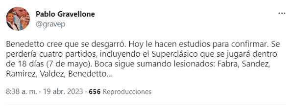 Según el periodista Pablo Gravellone, el delantero siente que sufrió un desgarro y este mismo miércoles se someterá a los estudios médicos que proporcionen un diagnóstico concreto. Si se confirman sus temores, se perdería entre otros partidos el Superclásico ante River en el Monumental, programado para el próximo 7 de mayo.