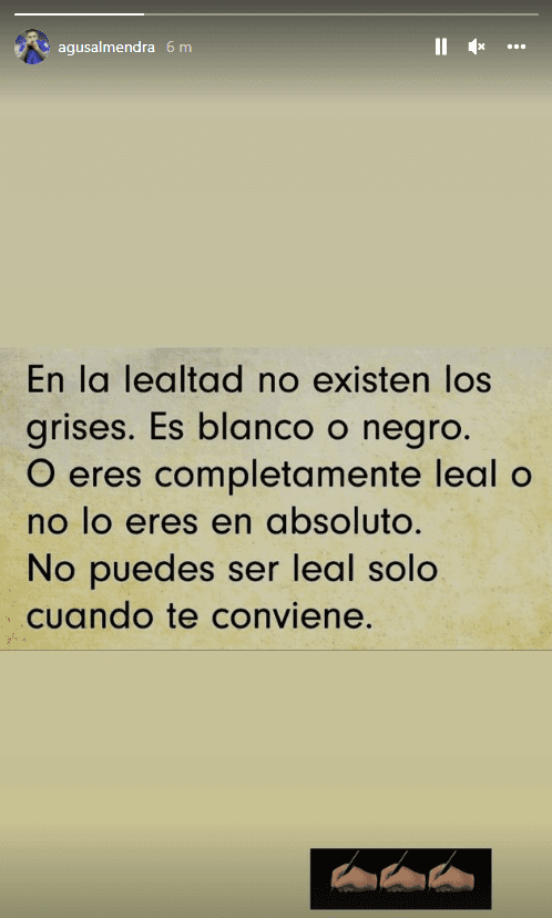 “En la lealtad no existen grises. Es blanco o negro. O eres completamente leal o no lo eres en absoluto. No puedes ser leal solo cuando te conviene”, dice la imagen que posteó Almendra en sus redes sociales para referirse, entre otras cosas, a las palabras de Darío Benedetto en la jornada de hoy. Casualmente, el “Pipa” lleva un tatuaje en el costado derecho de su cabeza con la palabra “lealtad”.