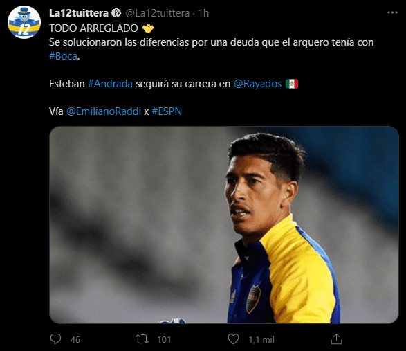 Si bien el traspaso por el talentoso arquero medoncino ya estaba arreglado, Boca reclamaba una deuda que tenía el jugador con la institución y eso aún amarraba el cierre de la transacción. Según informó Emiliano Raddi en ESPN, Esteban Andrada ya arregló todo con Boca y en las próximas horas será nuevo jugador de Rayados de Monterrey.