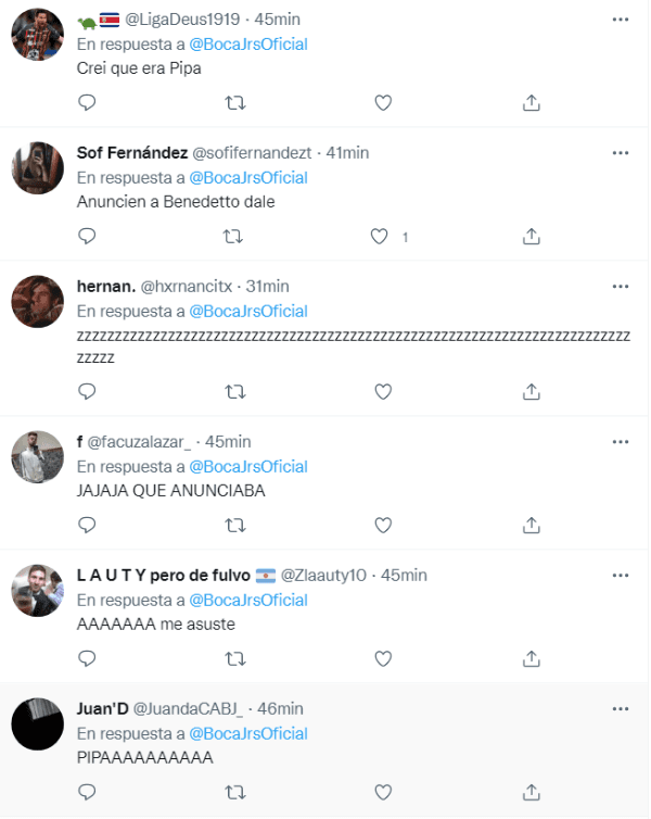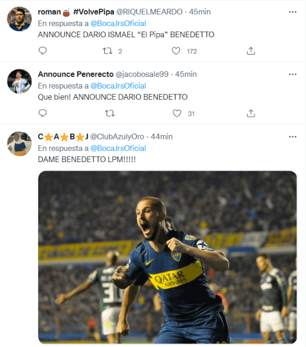 La cuenta oficial de Boca en la red del “pajarito azul” generó la locura de los hinchasal anunciar dos nuevas contrataciones de cara a la próxima temporada. ¿El motivo? Muchos usuarios mostraron su desilusión al ver que las publicaciones no se trataban de Darío Benedetto, sino de incorporaciones para el plantel femenino que recientemente campeonó ante San Lorenzo para despedir el año pasado. Los comentarios fueron casi en su totalidad con mensajes pidiendo al “Pipa”