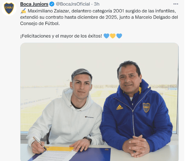 En esta ocasión, quien firmó su renovación contractual fue uno de los futbolistas que más le gusta a Riquelme. A pesar de no jugar en la posición de enganche, MaximilianoZalazarparece estardestinado a ser el próximo juvenil que idolatren los hinchas. Y por eso mismo, el Consejo de Fútbol acordó un vínculo que una al nacido en Ezeiza hasta fines de 2025.