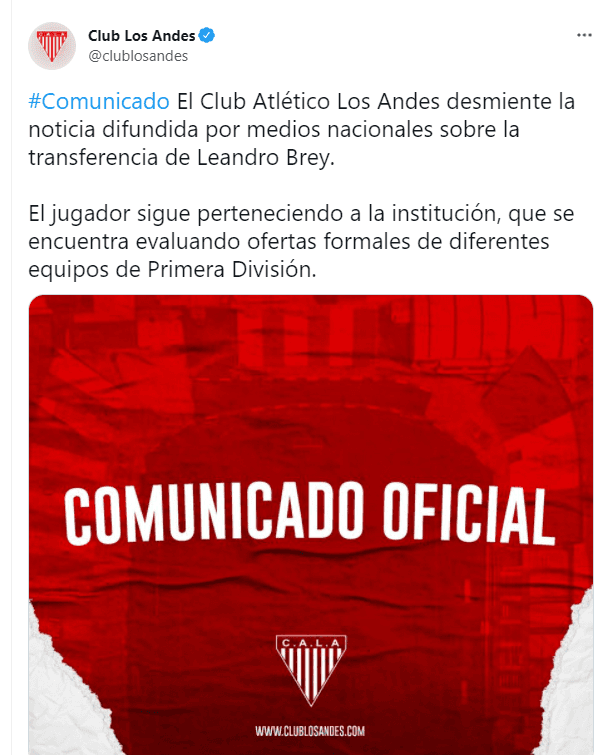 “El Club Atlético Los Andes desmiente la noticia difundida por medios nacionales sobre la transferencia de Leandro Brey. El jugador sigue perteneciendo a la institución, que se encuentra evaluando ofertas formales de diferentes equipos de Primera División”, posteó. ¿Uno de ellos será Boca y finalmente llegará? A esperar…