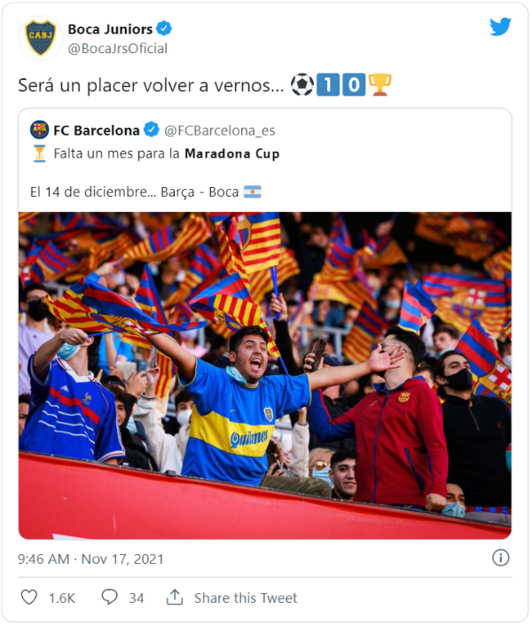 El 14 de noviembre, a falta de un mes para el compromiso, el club catalán sacó un tuit palpitando el enfrentamiento entre ambos. “Falta un mes para la Maradona Cup. El 14 de diciembre… Barça – Boca”, había escrito el equipo de Agüero en redes.