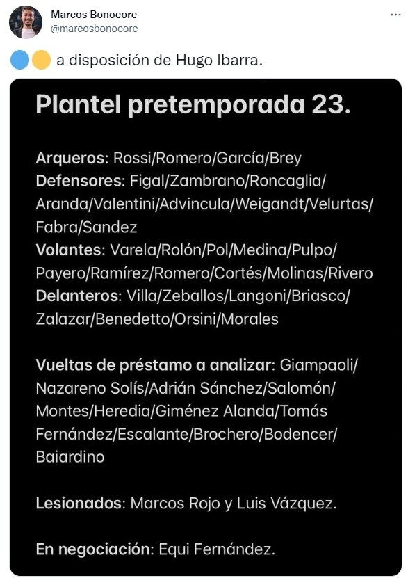 El periodista Marcos Bonocore trasladó a redes sociales la lista de jugadores que están a disposición de Hugo Ibarra para iniciar el trabajo preparativo para la temporada que comenzará oficialmente a fines de enero y, más allá de los que vuelven de los préstamos, una ausencia llamó la atención en los comentarios.